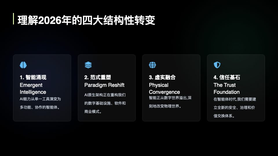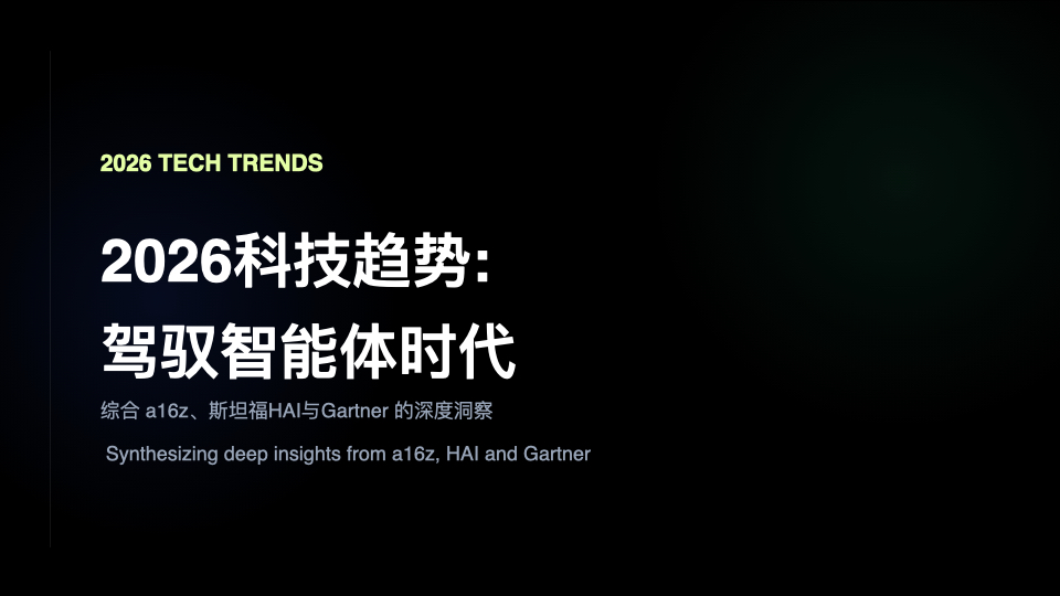 2026年,决定胜负的不是单点技术,今天的播客节目我们将解读了a16z的商业洞察、斯坦福的科研前瞻、Gartner的战略趋势,为你提炼出可行动的认知地图,总结了今年的四大趋势主题。