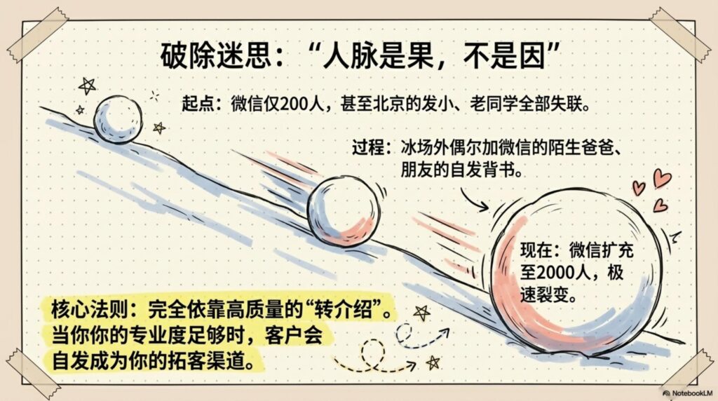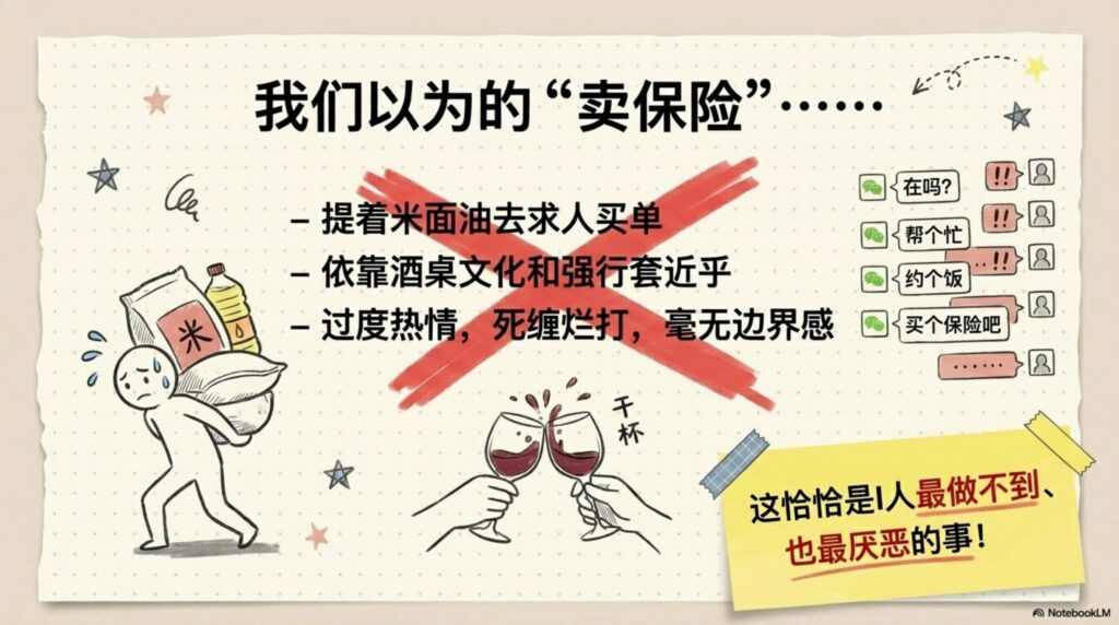 节目中,吴垠分享了她从海外归国、遭遇大厂求职瓶颈,到意外“正中下怀”进入友邦保险的传奇路径。 她曾是一个连冰场邻座家长都懒得打招呼的社交被动者,却凭借对专业逻辑的极度渴求和对“目标指向性”的深刻领悟,在不靠主动社交的情况下,通过高质量的转介绍建立起了七十多人的团队。 而王少卿则代表了典型的大厂中年转型心态:厌倦了复杂的办公室政治,追求极致的“舒适状态”。 他独创的“一页PPT”成单法,不促单、不打扰、不群发,却维持了极高的转化率,完美诠释了i人如何将“疏离感”转化为客户眼中的安全感。
