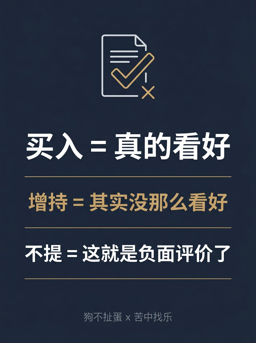 - 卖方研究 / 卖方服务 —— 券商研究所面向机构客户提供的一整套投资研究服务。报告只是载体,核心价值在于一对一的产业资源对接、投资机会挖掘和定制化信息服务。国内卖方因缺乏做空机制和需要维护上市公司关系,几乎不给出负面评级,“增持”往往意味着“没那么看好但必须给个评级”。