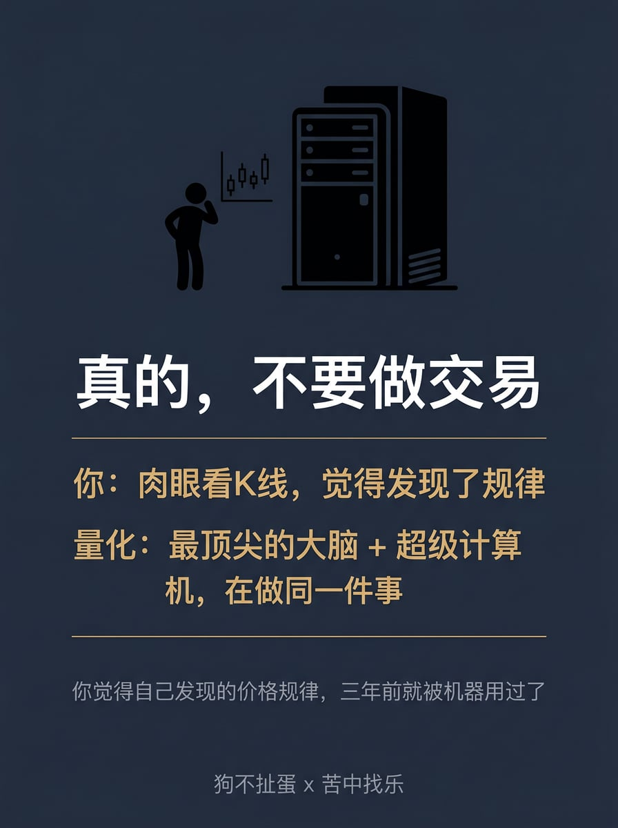 - 量化交易 —— 利用数学模型、统计方法和计算机程序,系统性地发现并利用市场价格规律进行交易。汇集了顶尖的人类大脑和机器算力,普通个人投资者试图通过观察价格规律做短线交易,本质上是在和这些机器竞争。