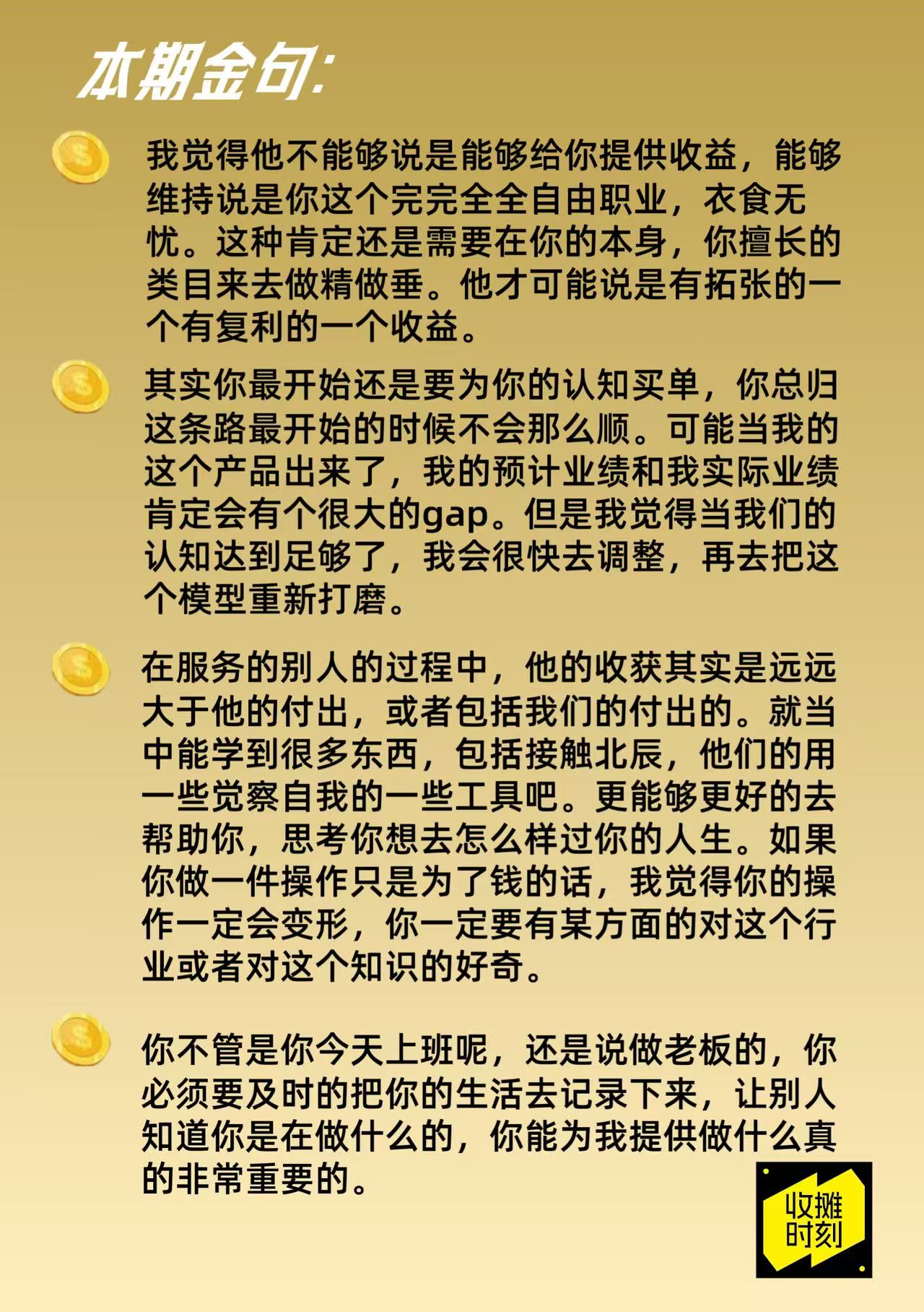 《收摊时刻》是一档主要围绕开店的搞钱经历复盘节目,钻研如何开源节流,优化盈利结构,吸取各行各业嘉宾的经验。每一个生意都需要在收摊以后进行反思,整理好状态再迎接新一天的营业。